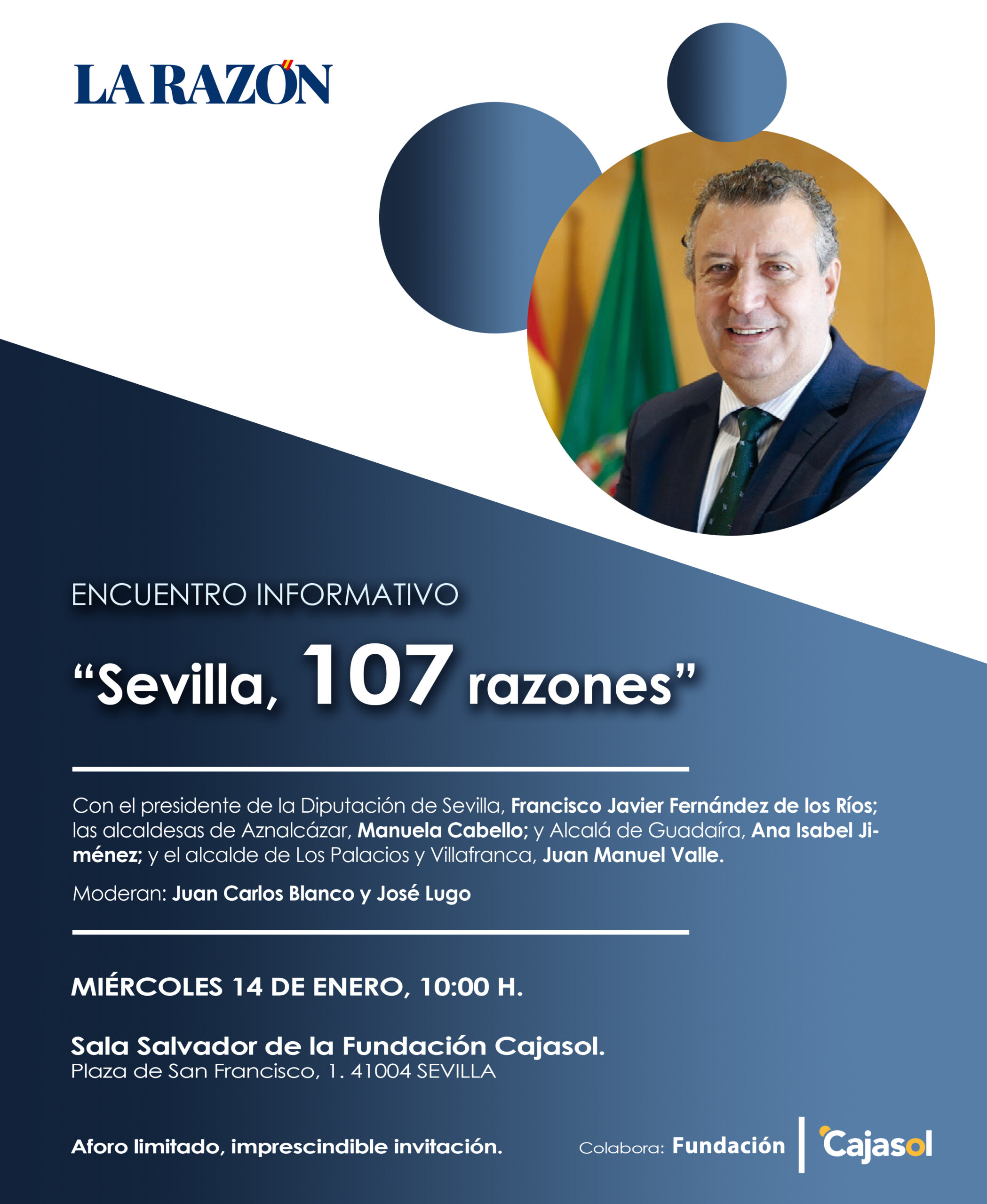 La Fundación Cajasol acogerá un nuevo Desayuno de Encuentro Informativo organizado por La Razón. En dicho encuentro, participarán el Presidente de la Diputación de Sevilla, Francisco Javier Fernández de los Ríos; las alcaldesas de Aznalcázar, Manuela Cabello y de Alcalá de Guadaíra, Ana Isabel Jiménez y el alcalde Los Palacios y Villafranca, Juan Manuel Valle. […]
