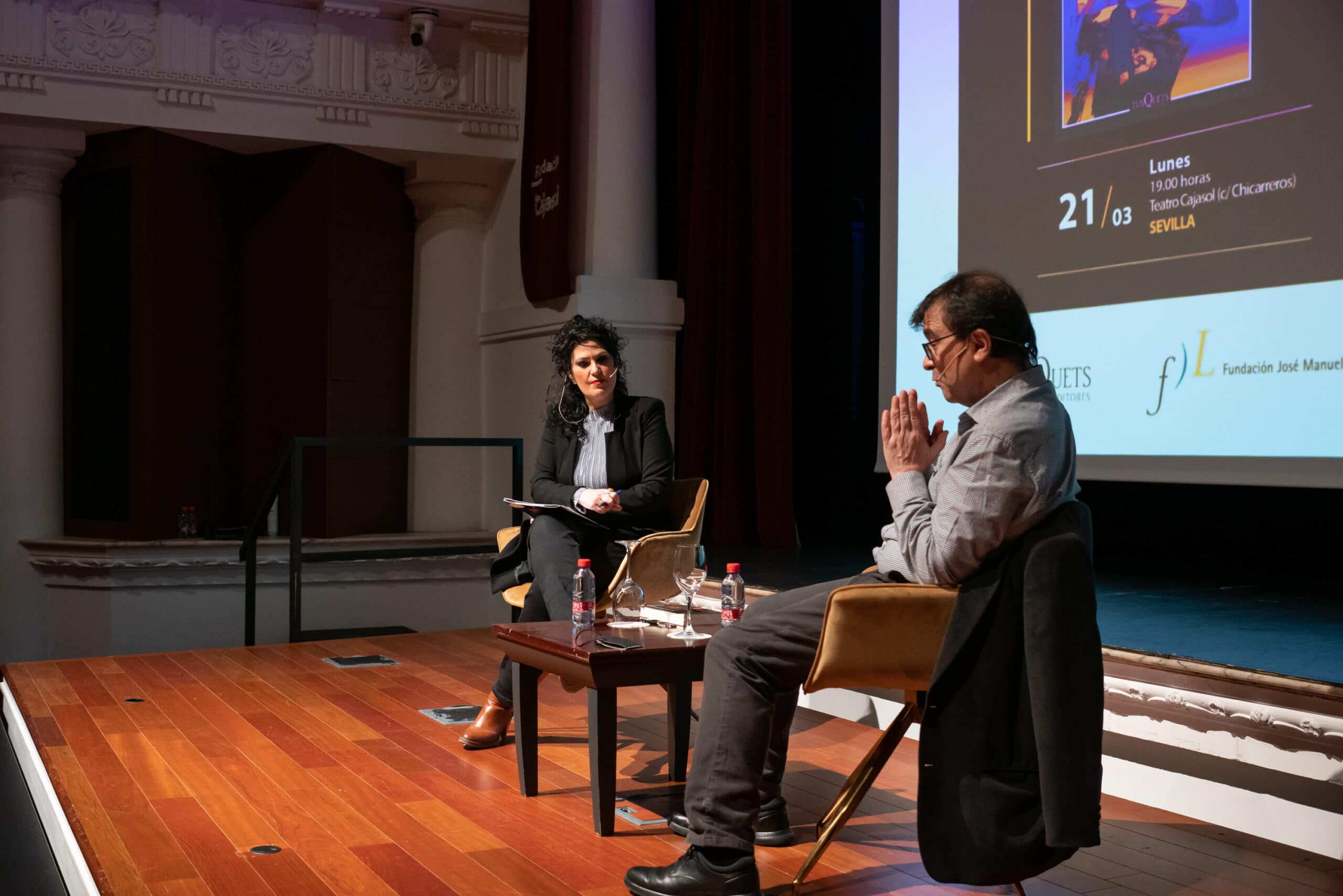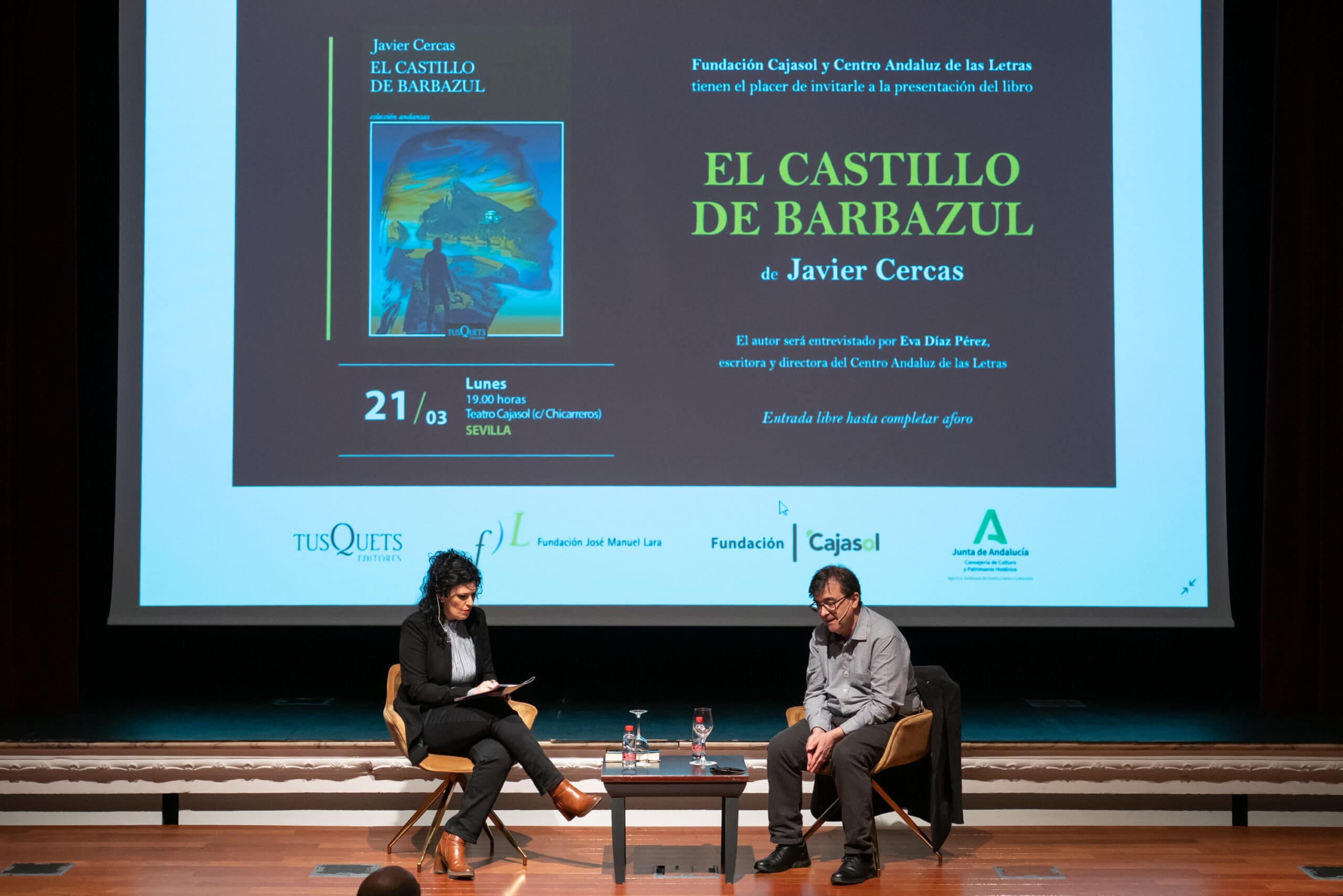Esta cita literaria, enmarcada dentro del ciclo Letras Capitales, ha contado con la presencia de Javier Cercas, acompañado por la directora del Centro Andaluz de las Letras, Eva Díaz Pérez. ‘El castillo de Barbazul’ (Tusquets, 2022) es la tercera entrega de la saga policíaca ‘Terra Alta’ del escritor Javier Cercas. Vuelve Melchor Marín para enfrentarse al peor de sus miedos: la desaparición de su hija. Y para comprobar que un hombre solo no basta para defenderse del abuso de los poderosos. Años después de lo ocurrido en Independencia, Melchor Marín ya no es policía: trabaja como bibliotecario y vive con su hija Cosette, convertida en una adolescente. Un día, Cosette descubre que su padre le ha ocultado cómo murió su madre, y este hecho la confunde y la subleva. Poco después parte de vacaciones a Mallorca, pero no regresa; tampoco contesta los mensajes ni las llamadas de Melchor, quien, convencido de que algo malo ha ocurrido, decide plantarse en la isla en busca de ella. A partir de aquí la novela se adentra en un laberinto absorbente, a la vez siniestro y luminoso, donde Melchor descubre que los seres humanos somos capaces de lo peor, pero también de lo mejor: que vivimos rodeados de violencia, mentiras, abusos de poder y cobardía, pero que también hay gente capaz de jugárselo todo por una causa justa. Astuta y felizmente disfrazada de novela de aventuras, El castillo de Barbazul acaba de desenmascarar las novelas de la Terra Alta como lo que son: el proyecto literario más ambicioso de Javier Cercas.